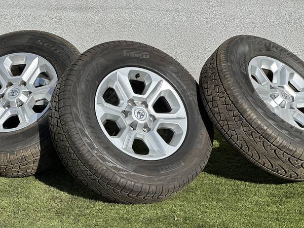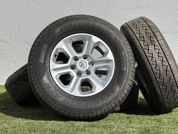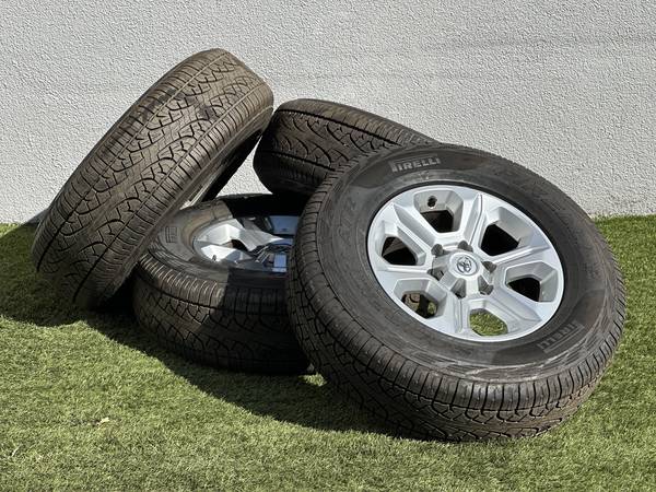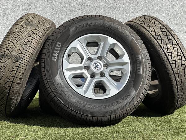 Like new Original 17" Toyota SR5 Rims in factory Silver finish, wrapped in Pirelli Scorpion ATR 265/70R17 tires.