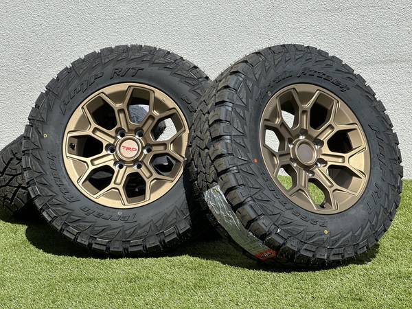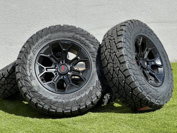 Set of 4, NEW 2025, Toyota Tacoma TRD Pro Style wheels nice Satin Black finish rims (bronze also available) 6x139.7 mm bolt pattern wrapped in AMP Terrain Attack R/T Tires size P 265/70R17 Rugged All Terrain.