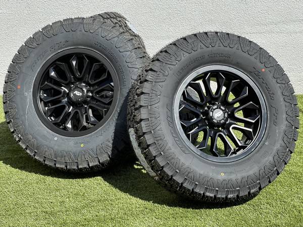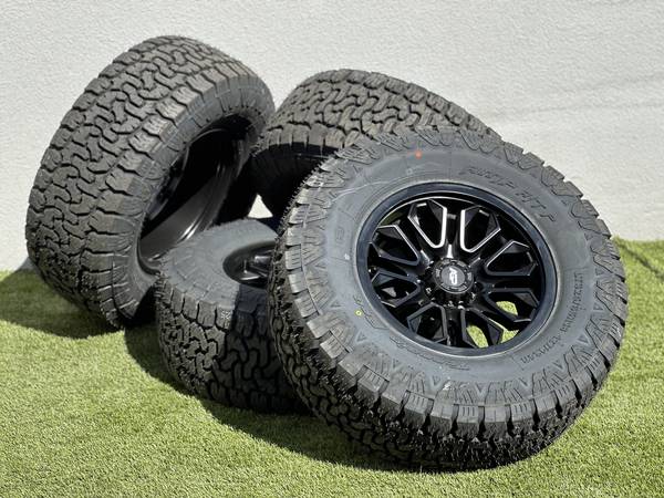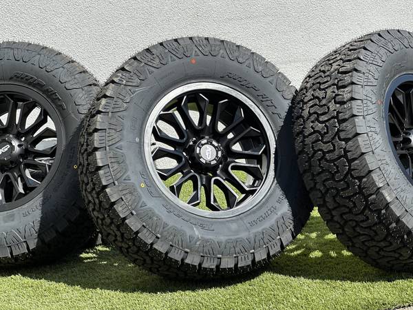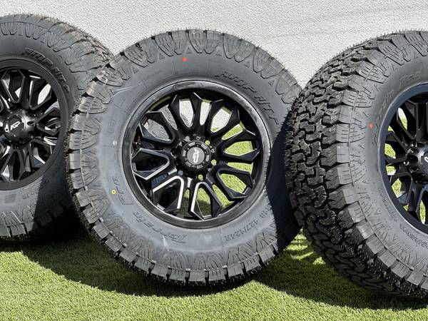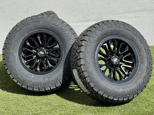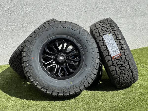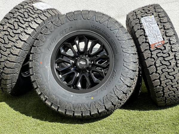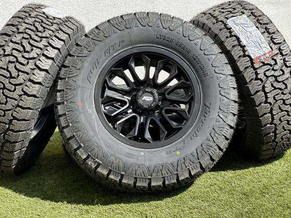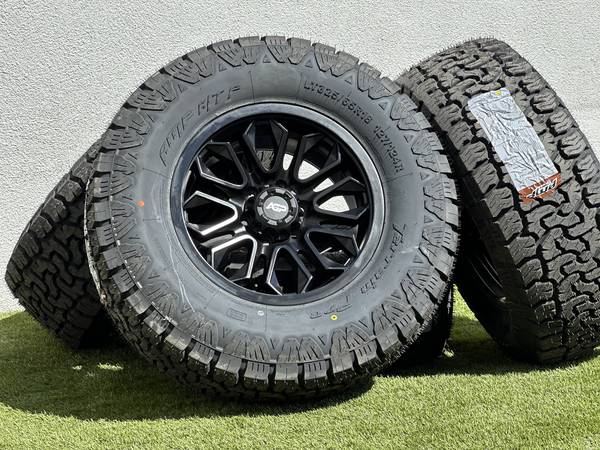 Brand new 18” AGP HD304 wheels in Matte Black finish, wrapped in AMP Terrain Pro A/T tires size LT325/65R18. These Load Range E, 10 ply tires are built for heavy-duty use, offering smooth on-road performance and rugged off-road grip. Rated for 60k miles with manufacturer warranty.