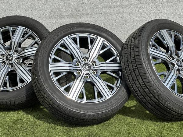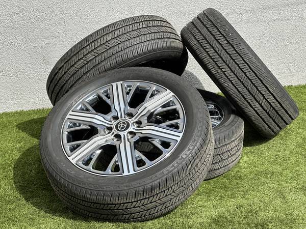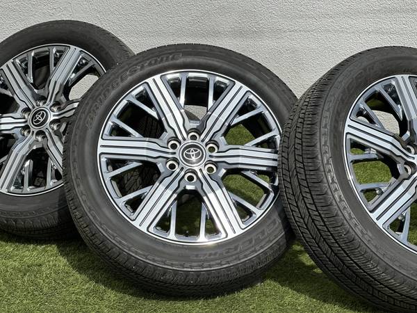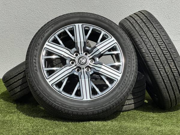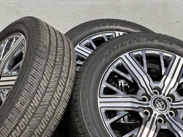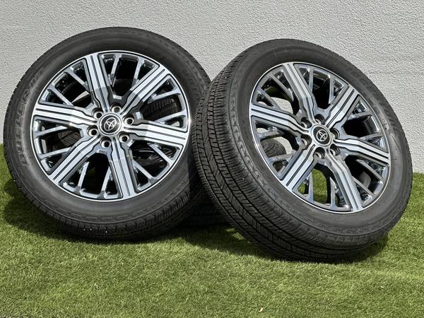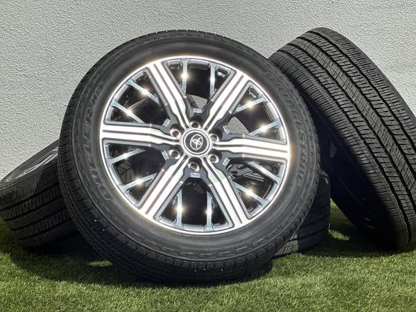 NEW OEM, 22” Toyota Tundra 4x4 Polished Silver, charcoal Grey and Chrome Original finish Capstone Package factory wheels wrapped in Bridgestone Dueler HT size 265/50r22 tires All Season.