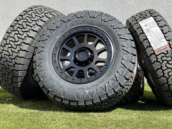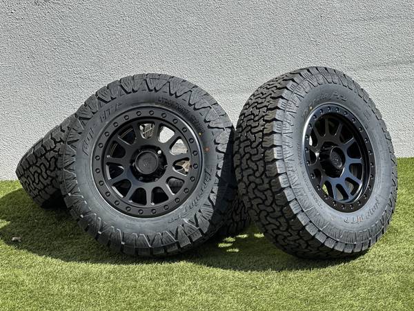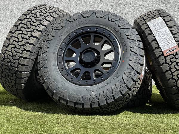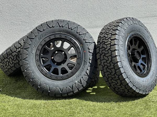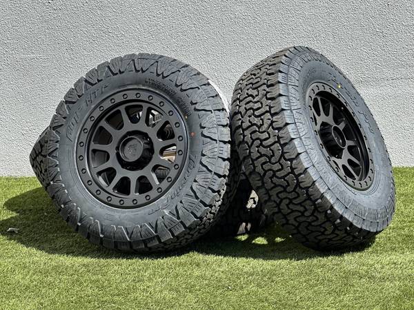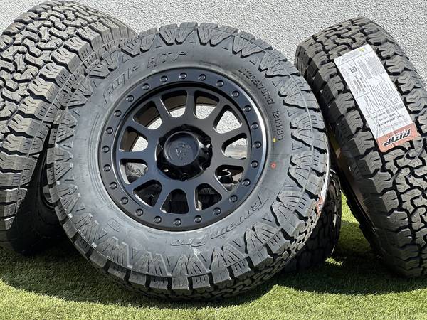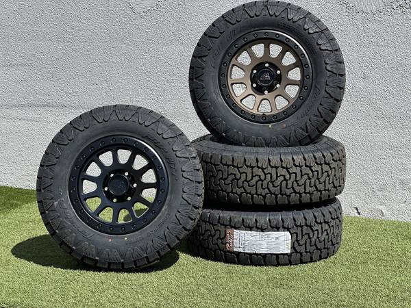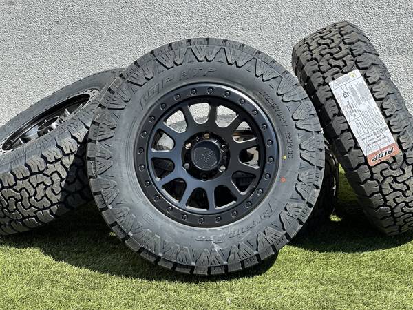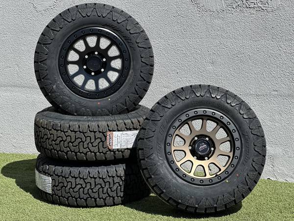 Brand new 17" Basta Rotary Forged RF1 wheels in Black (Bronze with a Polished Silver bead color options are also available), wrapped in AMP Terrain Pro All Terrain LT265/70R17 tires.