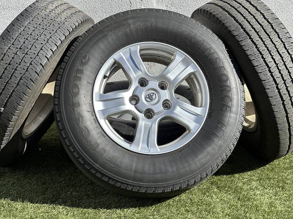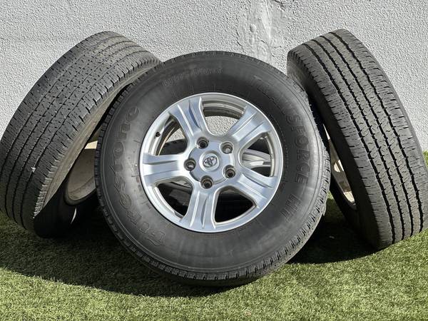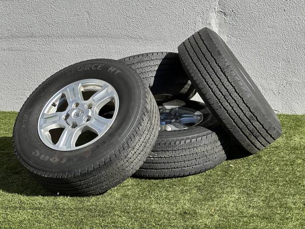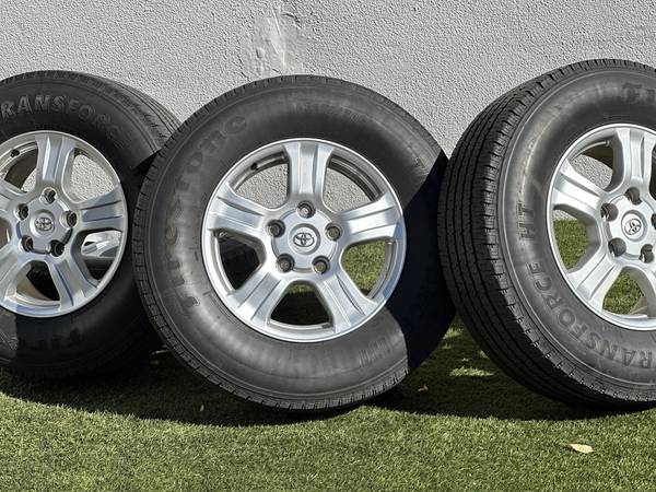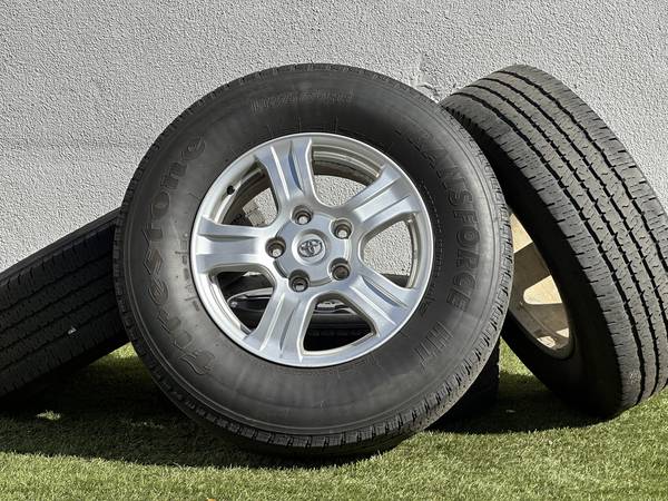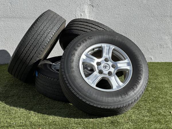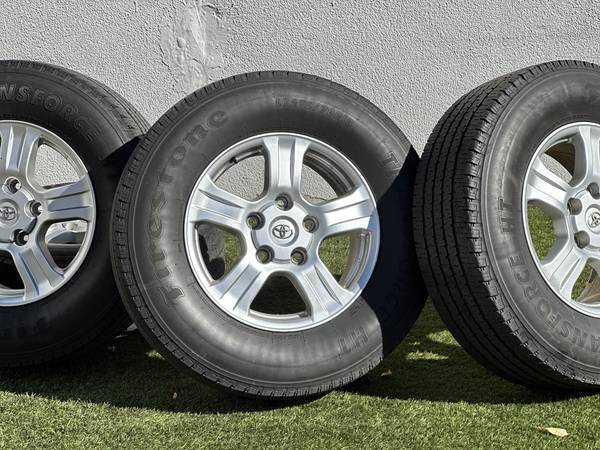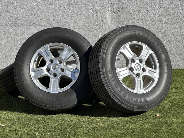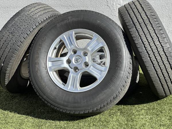 Excellent Condition, Original 18" Toyota Tundra SR5 wheels in Silver, wrapped in Firestone Transforce HT LT275/70R18 tires.