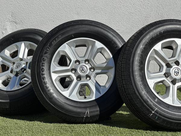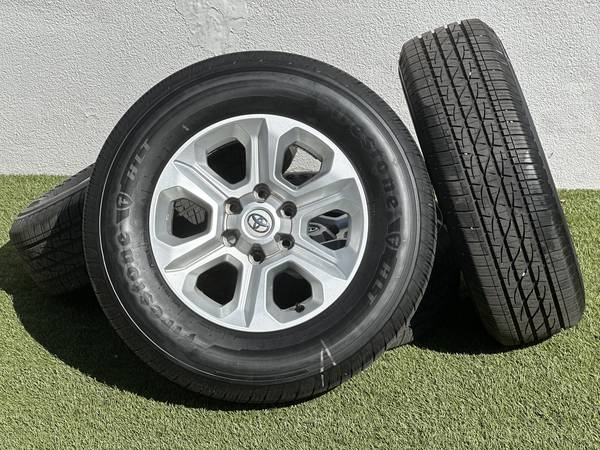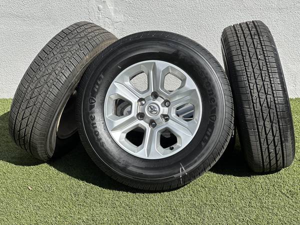Original Toyota 17” SR5 wheels in factory silver finish wrapped in Firestone HLT All Season 245/70R17 tires.