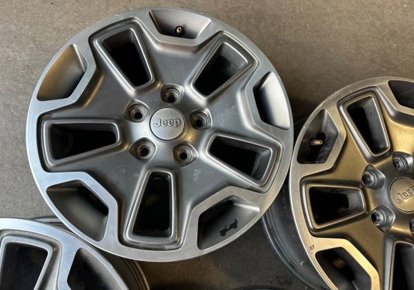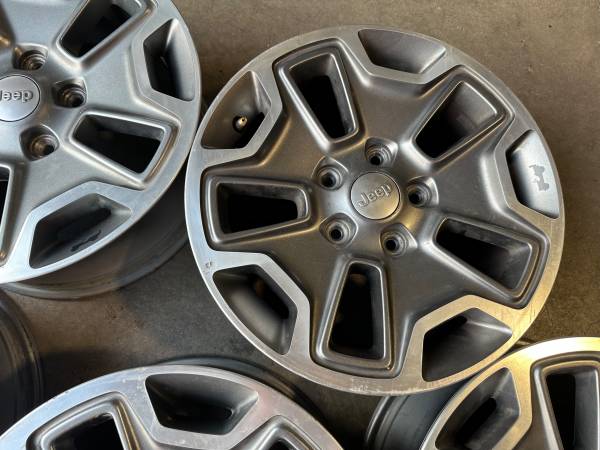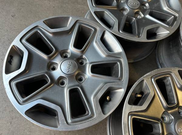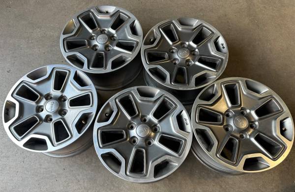 Call / Text: This set of 5 Wheels / Rims for $400 OEM Factory Rims Brand: Jeep Wrangler, Rubicon, & Grand Cherokee Wheel Size: 17” x 7.5” Bolt Pattern: 5x5 / 5x127 Offset: ET44.45 Finish: Grey...