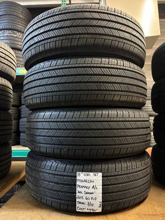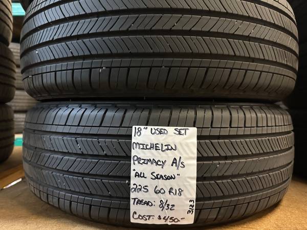 This listing is for a set of 4 Tires This set is priced at: $450 Installation is available. Michelin Primacy A/S All Season tires Size: 225/60R18, 225/60/18, 225 60R18 Tread depth: 8/32 DOT: 3123