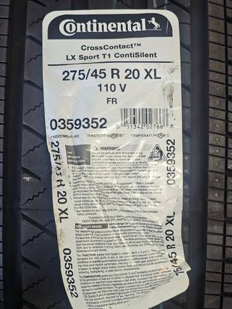 One 275/45R20 Continental All-Season ContiSilent Tesla Tire. Tire is brand new and has never been mounted. It appears drywall mud leaked onto a portion of the inside tire. This price is carry-out,...