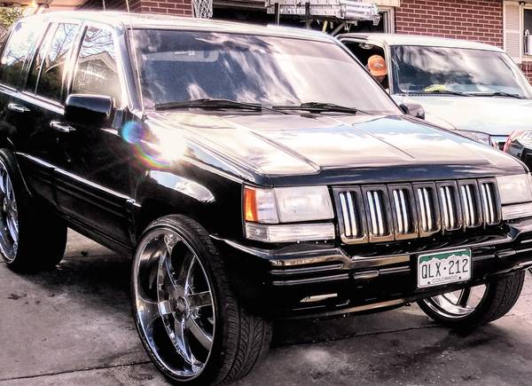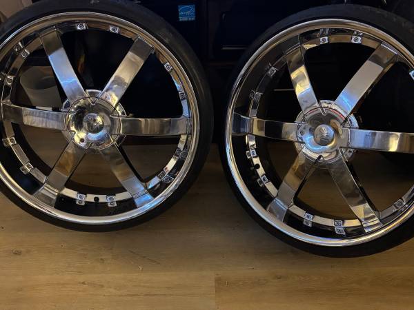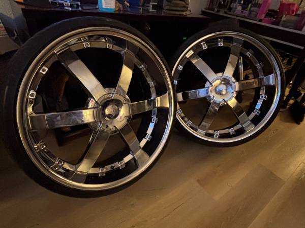 Velocity 26inch rims tires are the in great shape hade them on a Lincoln Navigator and a grand Cherokee but bought adapters to put on jeep they have all the center caps with them