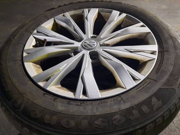 For sale FOUR nice like new lightly used VW Volkswagen Tiguan oem 17s wheels rims and 2 nice lightly used All-Season tires 215/65/17 Firestone All Season 215/65R17