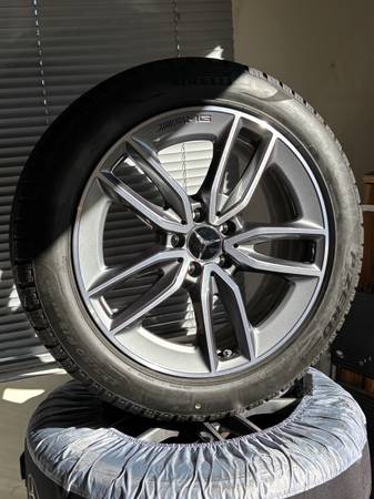 Mercedes-Benz AMG wheels and snow tires for sale pristine condition less than 200 miles. Set of 4 matching 19” 235/150/R19 No scuffs,scratches,or marks of any kind. Pirelli P/ZERO