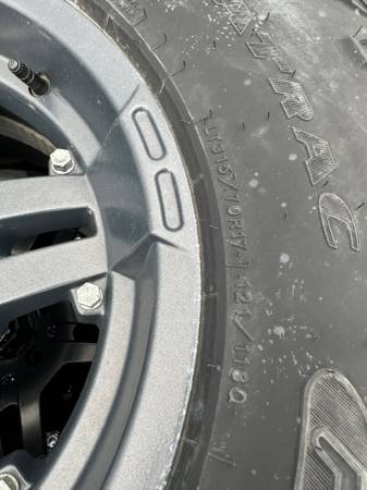 Selling a nice used set of five 17" ATX American Racing Wheels and 315/70R17 Goodyear Wrangler Duratrac Tires. All in good used shape, see pics for tread. Spare tire is brand new, unused. 5x5...