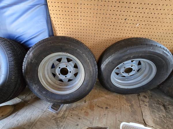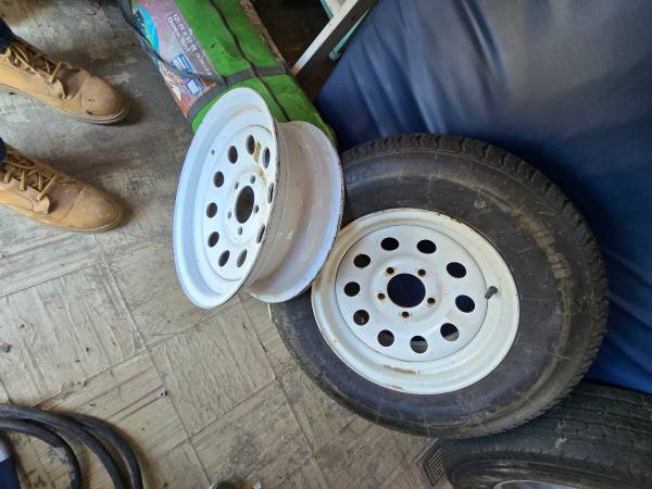 1 POWER KING ST 205 75 14 TIRE ON SILVER SPOKE RIM 8 DIAMOND HOLES 20% TREAD $40 OR $75 FOR THESE TWO