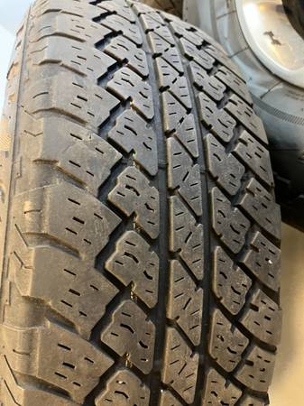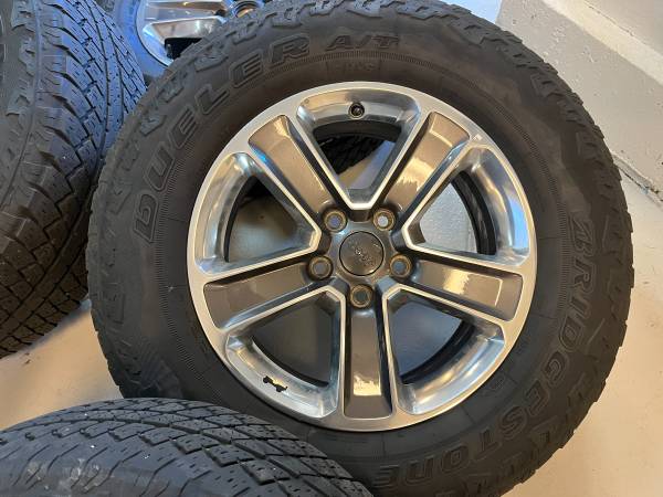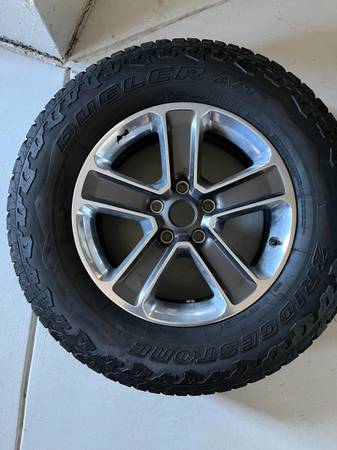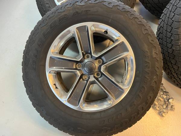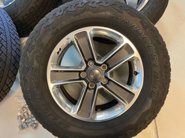 5 Bridgestone Dueller A/T Tires 1 Spare tire - new 4 tires are used - see photos for tread remaining. 255/70 R 18 M/S 5 Jeep Sahara rims - excellent condition. No curb rash (see photos) Lug nuts...