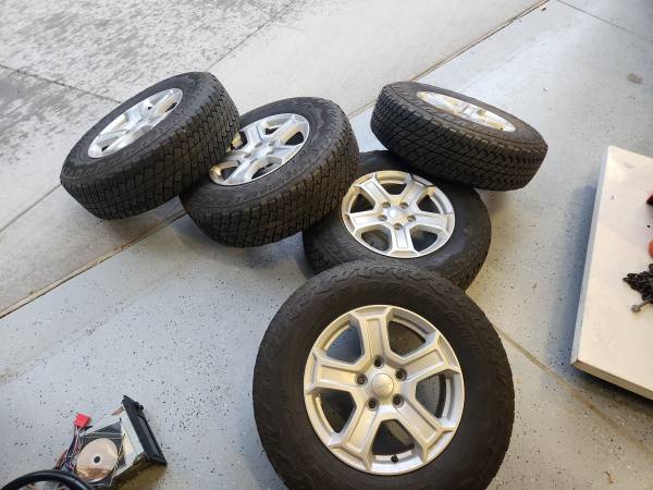 Set of 5 wheels and tires from a 2021 jeep wrangler. 245/75R17 One tire was the spare so its basically new. The other 4 are about 5/32. Only have four center caps. Dot on the tires are 2820 Bridgestone bueler A/T