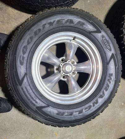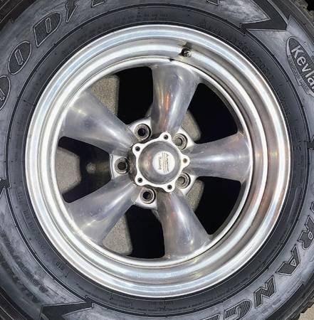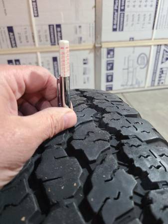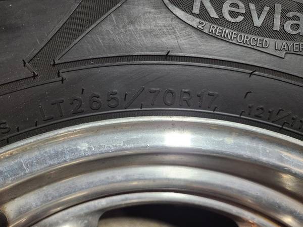 American Racing Wheels 3505293. LT 265/70R17 tread depth is 5-6 mm. Tires look good. No sidewall cracking. One tire does have a small sidewall cut, that's not very deep. Also comes with 40 brand new center cap screws (you only need 20 but that's how they sold them, so you have extras)