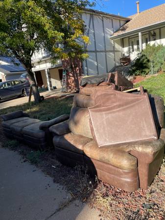 Heavy and sturdy reclining sofa and loveseat. On the curb at 3750 S Yampa St Aurora 80013. Backs are off the sofa for easier transport.
