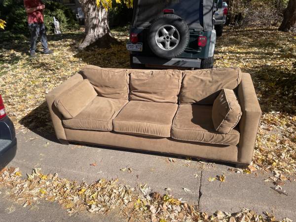 Great crate and barrrl sofa paid 2k dog hone. Needs a good cleaning but solid awesome sofa. 87 in long 36 deep On the curb for pickup. Will take down or mark pending for serious pick up.