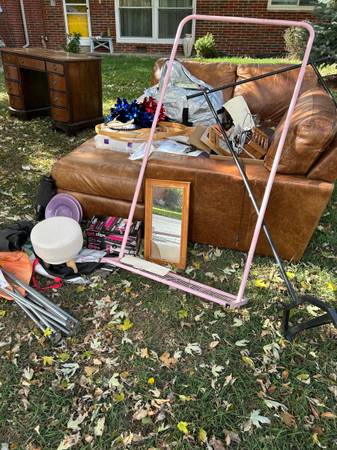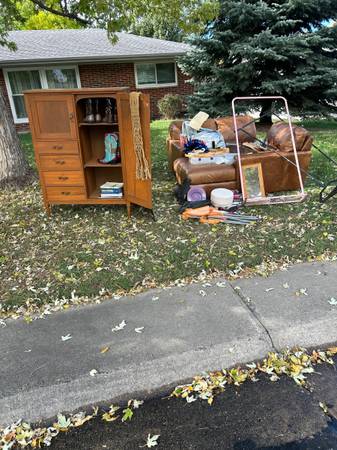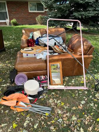 Free leather couch, craft supplies, clothes, sports equipment and furniture at my neighbors house, everything in the grass, curb alert! 451 s simms st, Lakewood. Come and get it:)