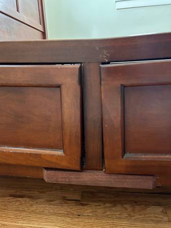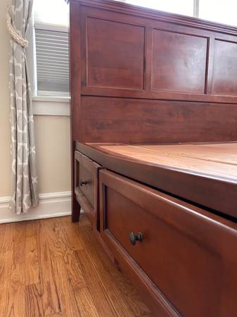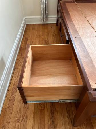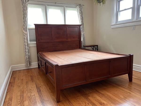 Sturdy queen bed frame with 6 big storage drawers built in. One side is slightly bowing (see photos 3 and 4), but still supports full weight. You must bring tools and disassemble to get it out (main...