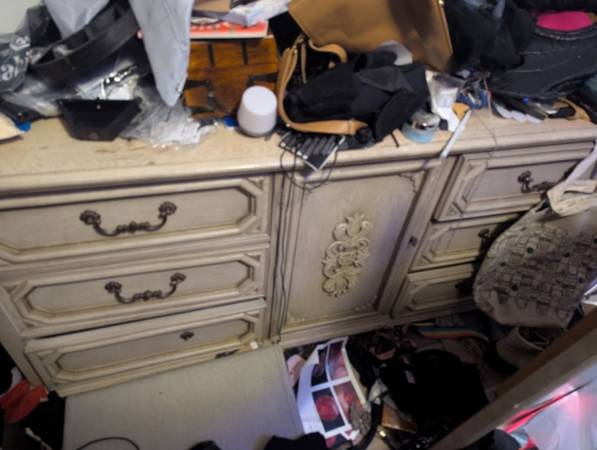Distressed ivory paint and scroll details, needs some love. A drawer front needs to be reattached, and a few of the knobs came loose. Free to whoever can come haul it away. As is, out on my porch.